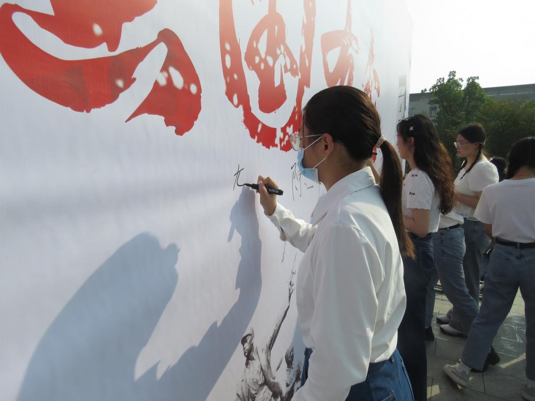 上午九点, 学院党政办主任杨硕鹏老师带领学院20名学生在图书馆南广场进行庄严宣誓。宣誓结束后,学生纷纷在展板上签下自己的姓名,以此来缅怀先烈,表达对革命先烈的敬仰和追思。