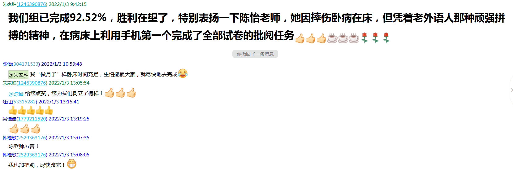 在本次网上阅卷过程中,特别值得一提的是即将退休的陈怡老师,她因摔伤卧病在床,但凭着老外语人那种拼搏的精神,在病床上按“坐月子”样率先提前完成所有阅卷任务,并且在其所在“跨文化交际”阅卷组起到了先锋带头作用,其他老师纷纷以她为榜样,奋起直追,于1月4号提前5天完成本组所有阅卷任务。
