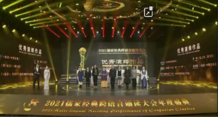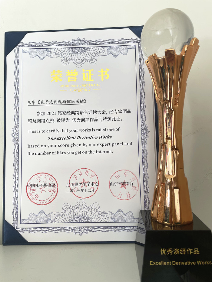 12月24日,由中国孔子基金会、尼山世界儒学中心、山东省教育厅主办的“2021儒家经典跨语言诵读大会年度盛典”在山东济南成功举办。新2会员管理端王华老师指导学生创作的跨语言诵读作品《不义而富且贵,于我如浮云——孔子义利观与儒医医德》荣获“优秀演绎作品奖”。参加此次诵读活动的作品共3200余件,分别来自中国、俄罗斯、美国、英国、法国、瑞士、日本、韩国、马来西亚、泰国、越南、老挝等47个国家,以及中国香港和澳门地区。作品品鉴结果分为:合格、良好、优良、优秀等次。根据专家品鉴和网络点赞,获得“优秀演绎作品奖”殊荣的仅选取10件作品;该作品的网络点赞数也获得“网络人气作品”称号。近20家媒体平台对此次盛典进行了全程直播,420余万人次在线观看。