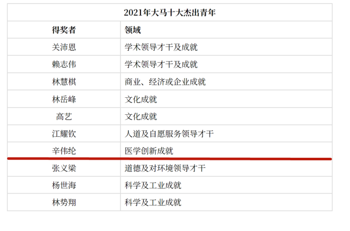 马来西亚十大杰出青年奖的宗旨,是要表扬在专业工作领域上有卓越表现,并对社会作出贡献的大马青年。辛伟纶校友发扬中医文化,心怀大爱,当为青年人的学习楷模。