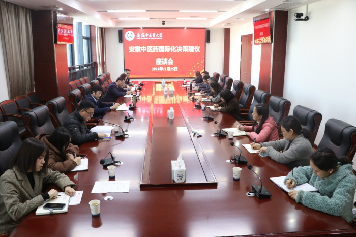 11月25日下午,在我校图书馆第一会议室召开安徽中医药国际化发展座谈会,校长彭代银出席并主持会议,安徽济人药业有限公司,学校科技处、中医学院、针灸推拿学院、药学院、医药经济管理学院、新2会员管理端、第二附属医院等相关单位负责人参加座谈会。