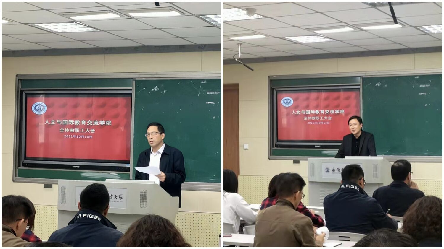 周亚东院长重点传达了学校职称评定、美育综合改革等有关文件、会议精神,从行政管理、教学科研、平台建设、师资队伍、国际合作交流等方面总结并部署工作,号召全体教职工落实学校等相关文件精神,做好本职工作,积极参与学术交流,尽早谋划申报省级、国家级人文社科项目。